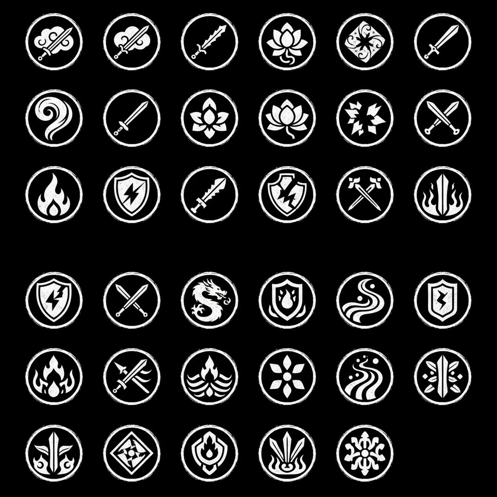 game icon sprite sheet, 8x8 grid, 64 flat icons, chinese xianxia cultivation theme, white ink style on black background : A professional 8x8 game icon sprite sheet for a Xianxia RPG. The icons are minimalistic, symbolic, and flat. Style: Traditional Chinese ink wash painting aesthetic but modernized for game UI. Colors: Main elements are pure White, secondary details are Light Grey. High contrast against a dark background. Texture: Edges have slight maobi (calligraphy brush) texture, elegant curves, cloud patterns, and fire patterns. System icons like Lotus (rebirth), Scroll (quest), Cauldron (alchemy), Bag (inventory), Jade talisman. Abstract skill icons showing motion and impact. Sword slashes, Yin-Yang symbols, swirling wind, fire bursts, lightning zig-zags, spiritual energy waves. --s 50 --no frames --no borders