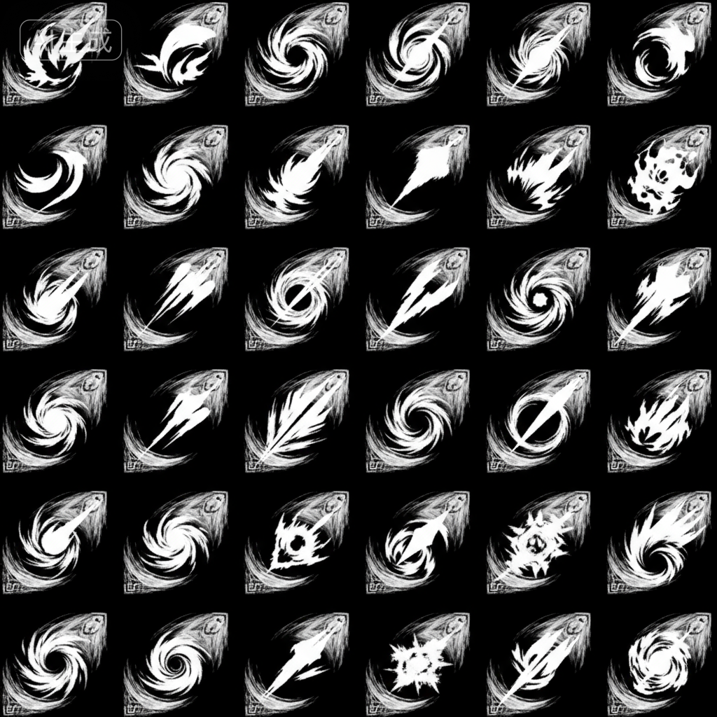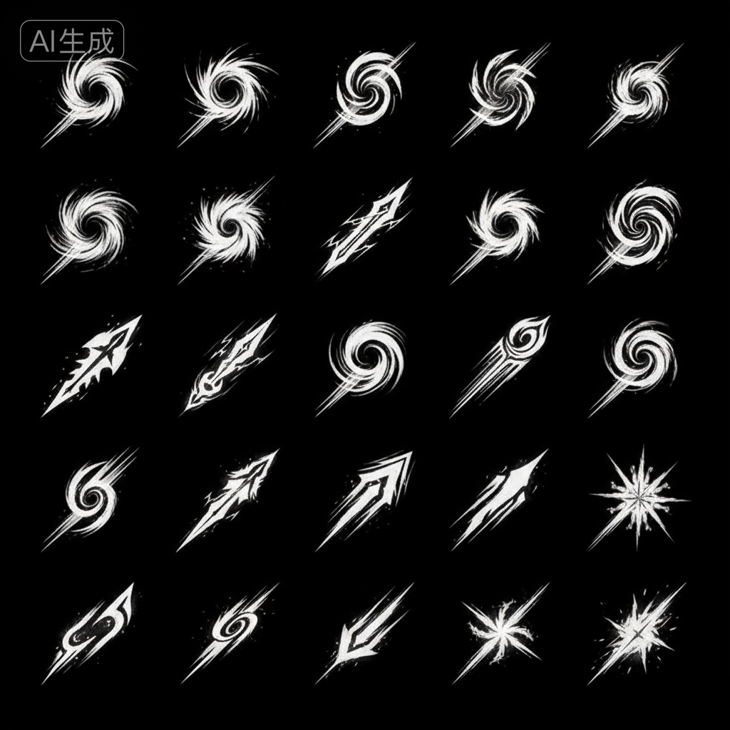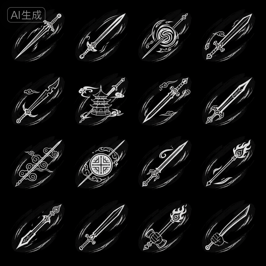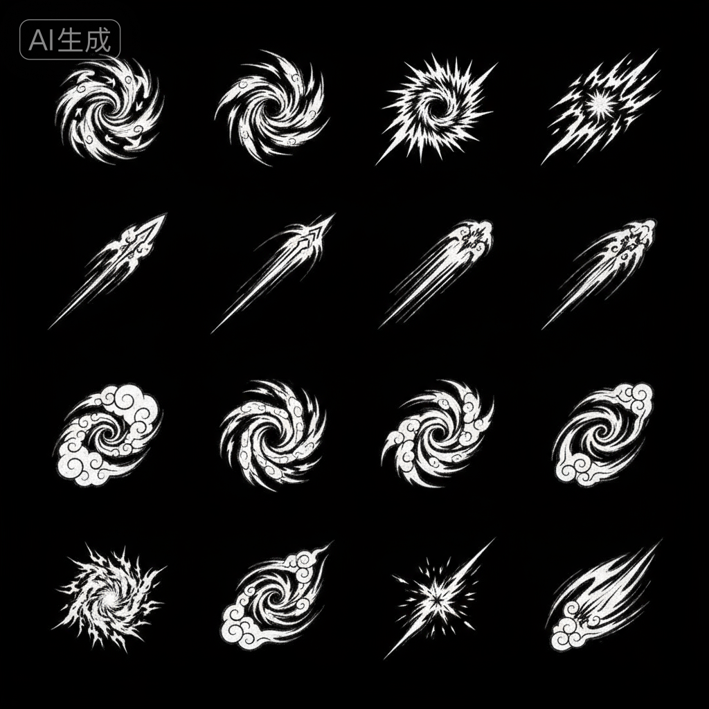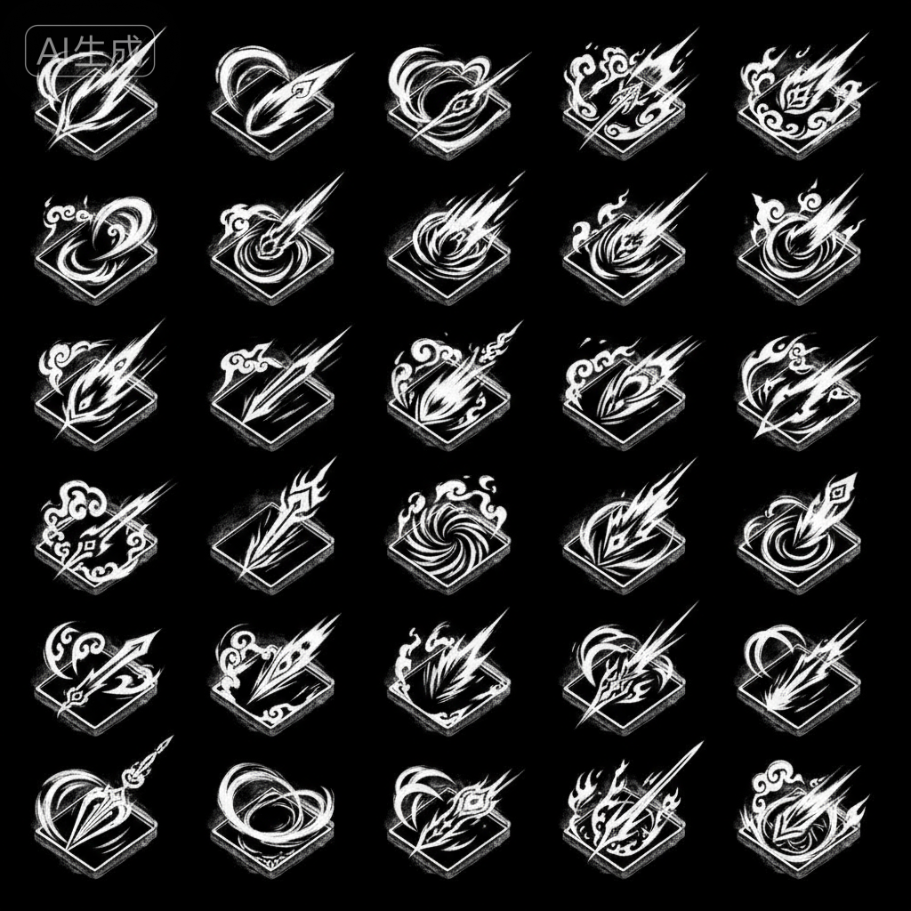 - 优化后: 画一道凌厉的白色撇捺(笔触),带一点枯笔飞白,玩家一看就知道这是锋利的剑气。这就是你要求的“不像素描,要偏游戏感觉”。